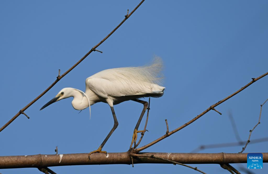An egret walks on a bamboo branch in Zhuxi Township, Dazu District of southwest China's Chongqing Municipality, April 21, 2025. This spring more than a thousand egrets have come to inhabit along the Laixi River in Zhuxi Township, a result of continuous ecological protection efforts of local government. The egrets, a manifestation of local ecological restoration, have added vigor and vitality here as well. (Xinhua/Chen Cheng)