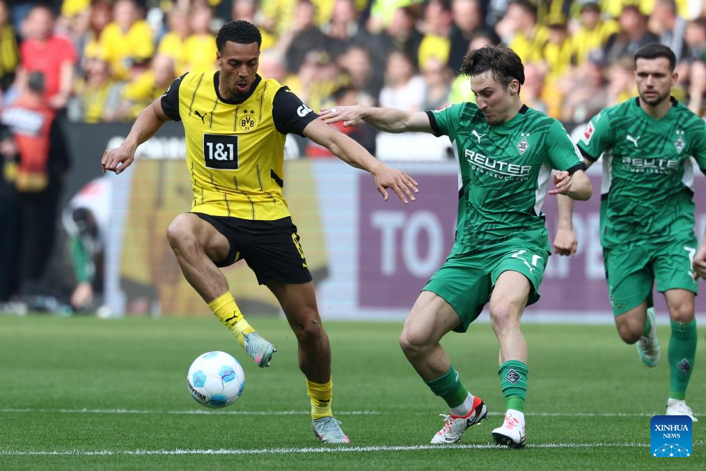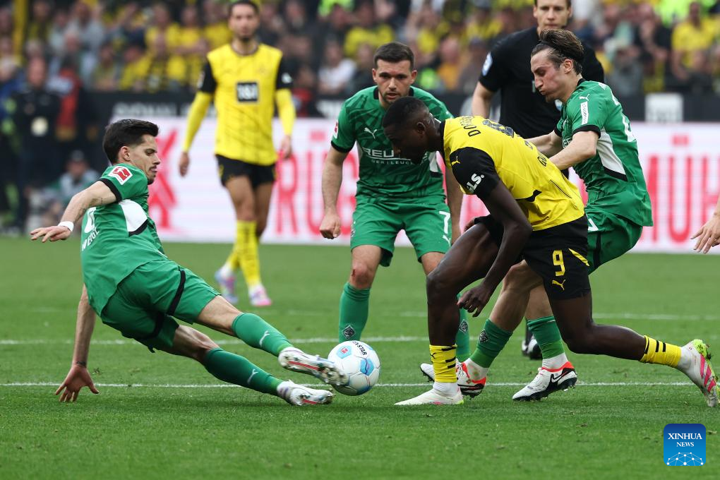 (250421) -- DORTMUND, April 21, 2025 (Xinhua) -- Serhou Guirassy (2nd R) of Borussia Dortmund vies with Julian Weigl (1st L) of Borussia Moenchengladbach during the first division of Bundesliga football match between Borussia Dortmund and Borussia Moenchengladbach in Dortmund, Germany, April 20, 2025. (Photo by Joachim Bywaletz/Xinhua)