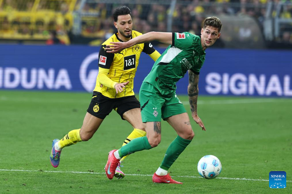 (250421) -- DORTMUND, April 21, 2025 (Xinhua) -- Ramy Bensebaini (L) of Borussia Dortmund vies with Tomas Cvancara of Borussia Moenchengladbach during the first division of Bundesliga football match between Borussia Dortmund and Borussia Moenchengladbach in Dortmund, Germany, April 20, 2025. (Photo by Joachim Bywaletz/Xinhua)
