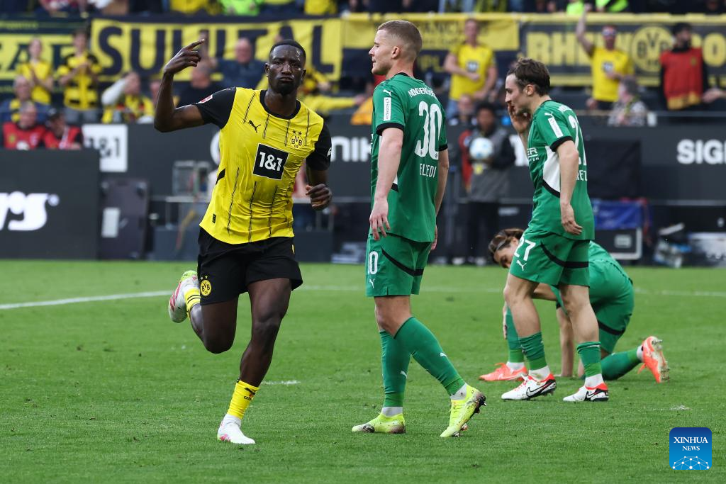 (250421) -- DORTMUND, April 21, 2025 (Xinhua) -- Serhou Guirassy (L) of Borussia Dortmund celebrates scoring during the first division of Bundesliga football match between Borussia Dortmund and Borussia Moenchengladbach in Dortmund, Germany, April 20, 2025. (Photo by Joachim Bywaletz/Xinhua)