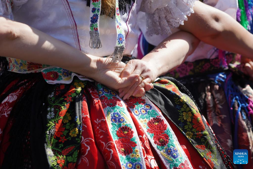 People in traditional costumes celebrate Easter in Holloko, Hungary, on April 21, 2025. (Xinhua/Chen Hao)