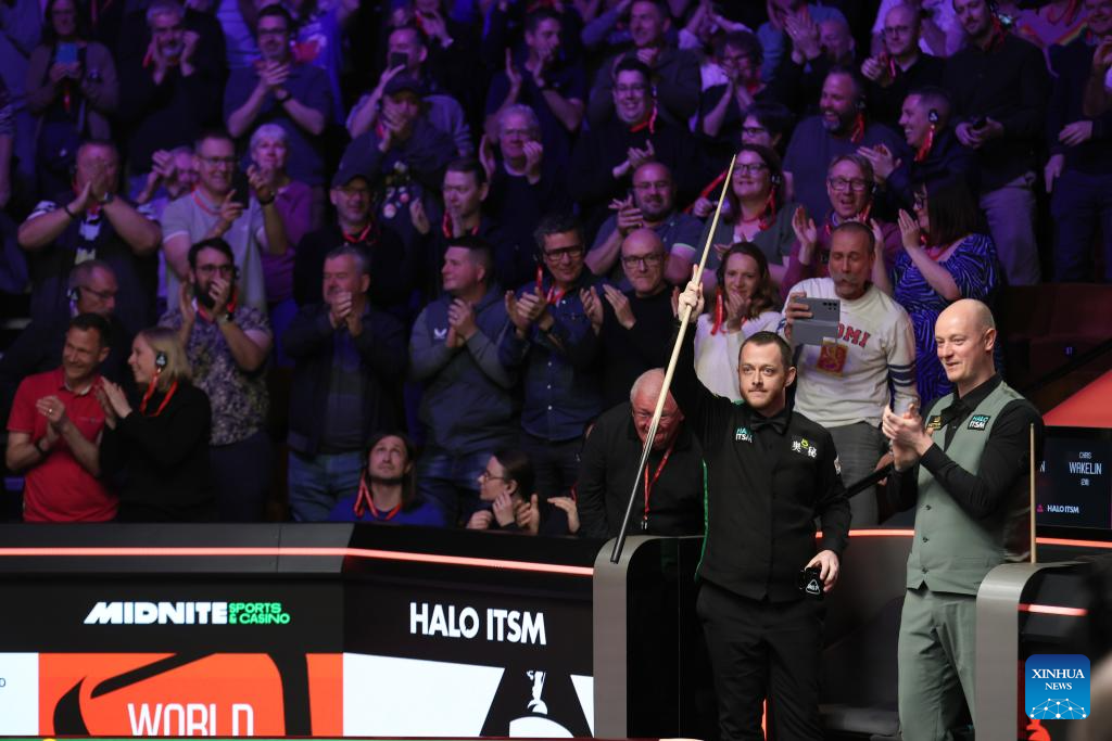 Mark Allen (L) of Northern Ireland celebrates after scoring a 147 break during the round 2 match between Chris Wakelin of England and Mark Allen of Northern Ireland at World Snooker Championship 2025 in Sheffield, Britain, April 25, 2025. (Photo by Zhai Zheng/Xinhua)