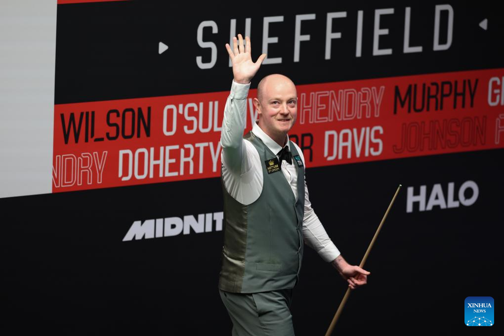 Chris Wakelin of England celebrates after the round 2 match between Chris Wakelin of England and Mark Allen of Northern Ireland at World Snooker Championship 2025 in Sheffield, Britain, April 25, 2025. (Photo by Zhai Zheng/Xinhua)