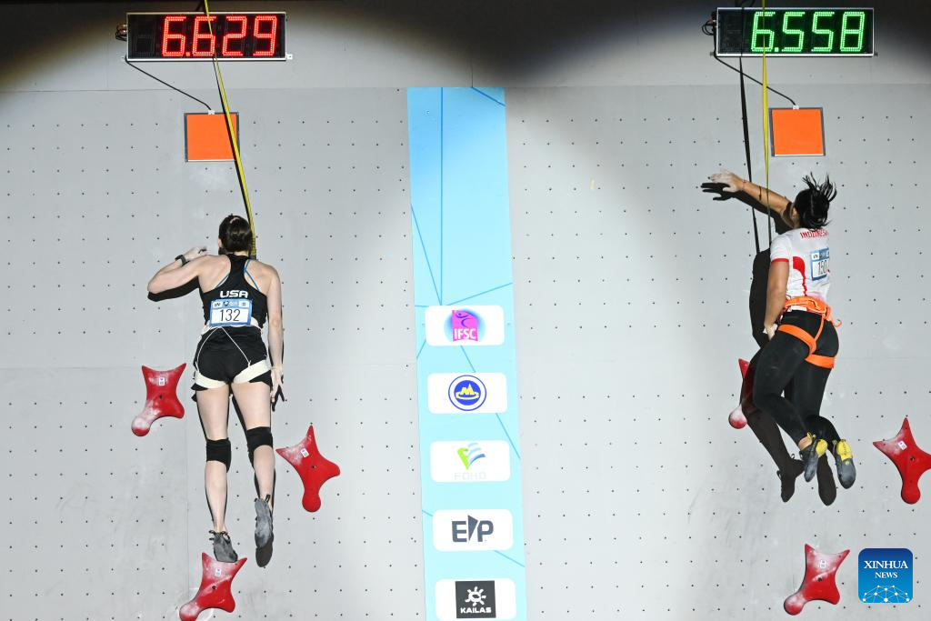 Emma Hunt (L) of the United States and Desak Made Rita Kusuma Dewi of Indonesia compete during the women's speed qualification at the IFSC World Cup Wujiang 2025 in Suzhou, east China's Jiangsu Province, April 25, 2025. (Photo by Wang Xuzhong/Xinhua)