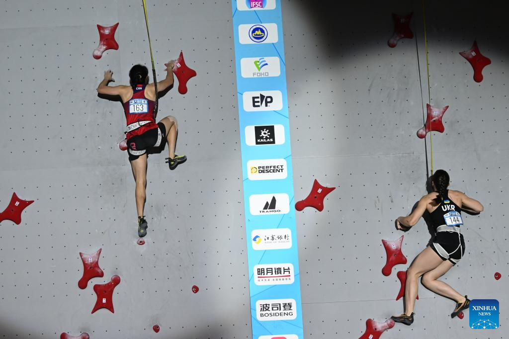 Zhang Shaoqin (L) of China and Daria Tkachova of Ukraine compete during the women's speed qualification at the IFSC World Cup Wujiang 2025 in Suzhou, east China's Jiangsu Province, April 25, 2025. (Photo by Wang Xuzhong/Xinhua)