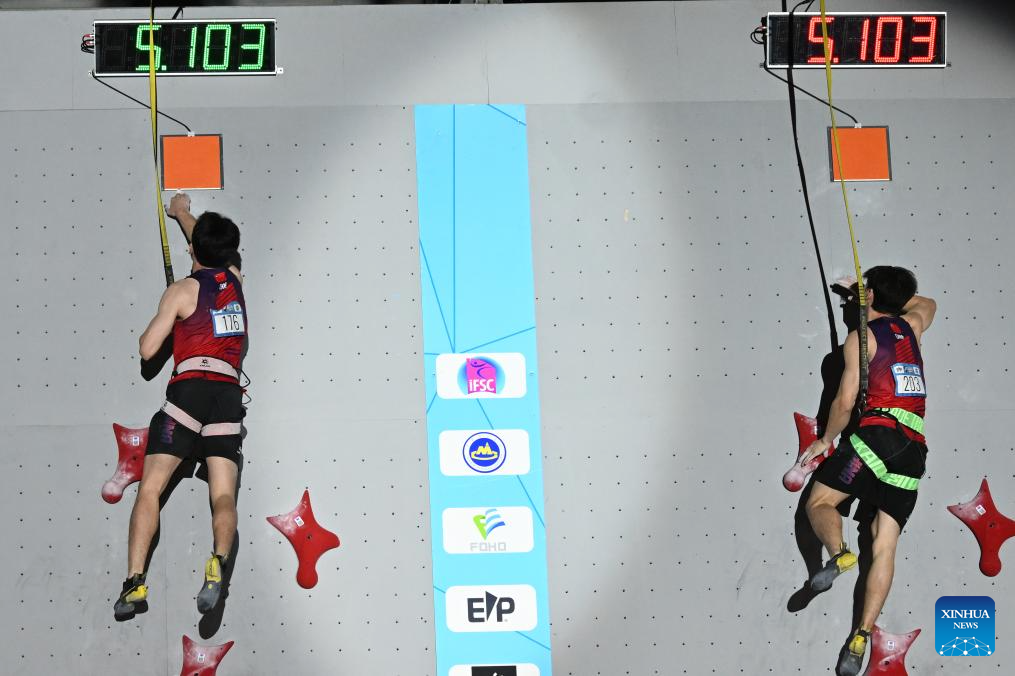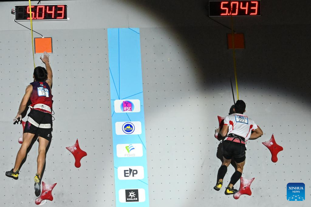 Li Xu (L) of China and Alfian Muhammad Fajri of Indonesia compete during the men's speed qualification at the IFSC World Cup Wujiang 2025 in Suzhou, east China's Jiangsu Province, April 25, 2025. (Photo by Wang Xuzhong/Xinhua)
