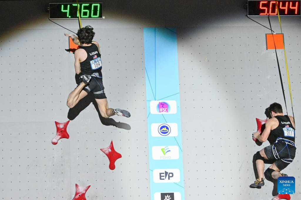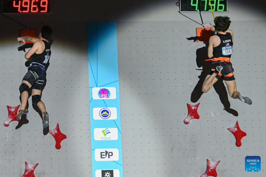 Zach Hammer (L) and Samuel Watson of the United States compete during the men's speed qualification at the IFSC World Cup Wujiang 2025 in Suzhou, east China's Jiangsu Province, April 25, 2025. (Photo by Wang Xuzhong/Xinhua)