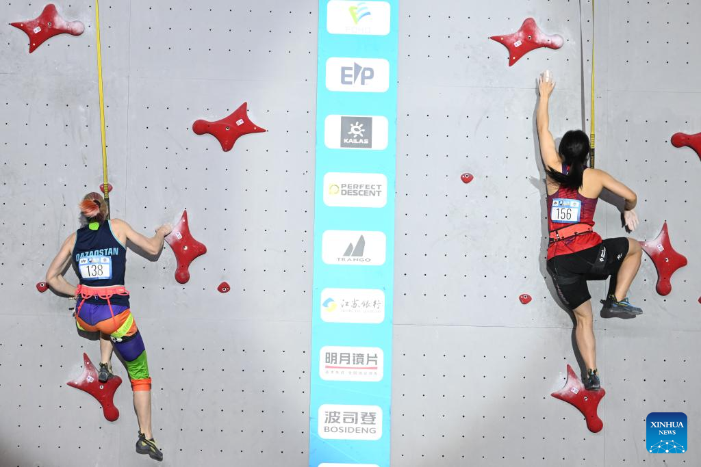 Tamara Ulzhabayeva (L) of Kazakhstan and Shi Xinyue of China compete during the women's speed qualification at the IFSC World Cup Wujiang 2025 in Suzhou, east China's Jiangsu Province, April 25, 2025. (Photo by Wang Xuzhong/Xinhua)