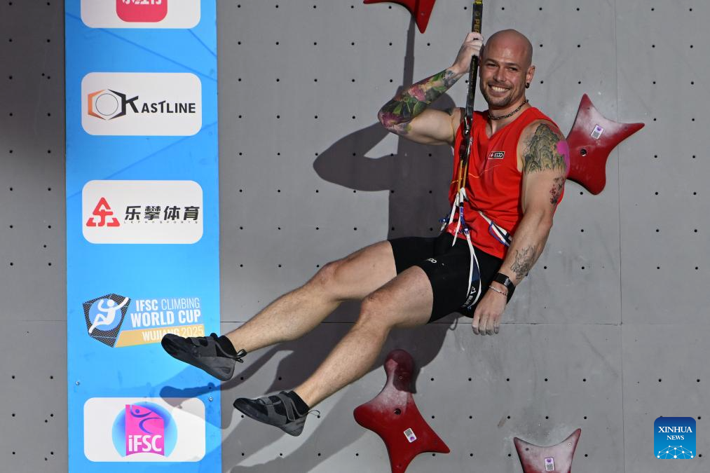 Erik Noya Cardona of Spain reacts after the men's speed qualification at the IFSC World Cup Wujiang 2025 in Suzhou, east China's Jiangsu Province, April 25, 2025. (Photo by Wang Xuzhong/Xinhua)