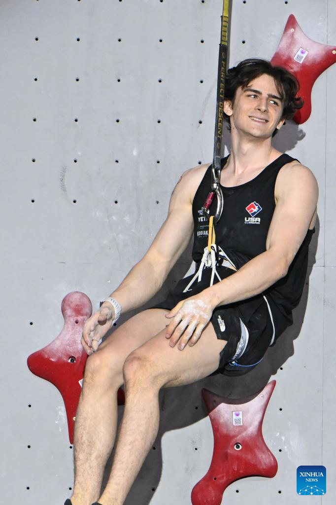 Samuel Watson of the United States reacts after the men's speed qualification at the IFSC World Cup Wujiang 2025 in Suzhou, east China's Jiangsu Province, April 25, 2025. (Photo by Wang Xuzhong/Xinhua)