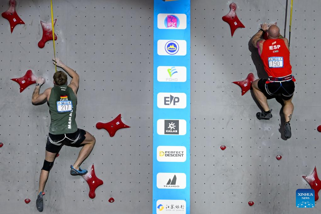 Linus Bader (L) of Germany and Erik Noya Cardona of Spain compete during the men's speed qualification at the IFSC World Cup Wujiang 2025 in Suzhou, east China's Jiangsu Province, April 25, 2025. (Photo by Wang Xuzhong/Xinhua)
