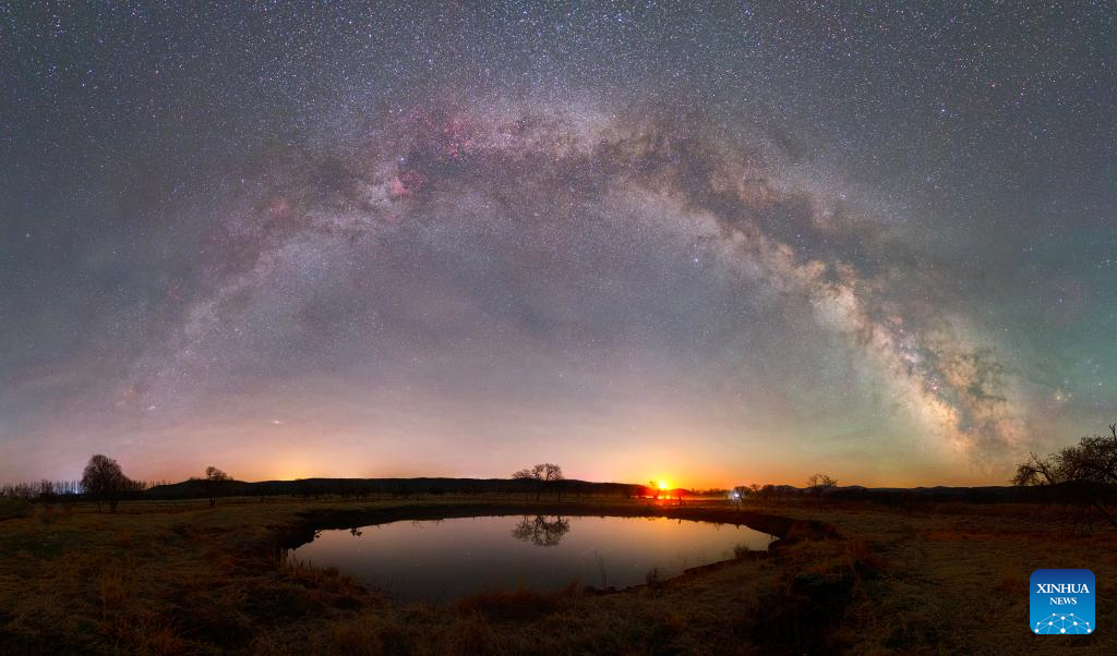 This stitched photo taken on April 23, 2025 shows the Milky Way over Jingpo Lake scenic spot in Mudanjiang City, northeast China's Heilongjiang Province. (Photo by Wang Baoxun/Xinhua)