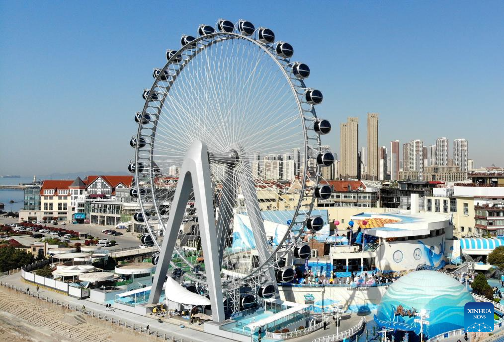 This drone photo taken on April 25, 2025 shows a Ferris wheel at Qingdao Polar Ocean Park in Qingdao, east China's Shandong Province. The Ferris wheel was put into operation here on Friday. (Xinhua/Li Ziheng)