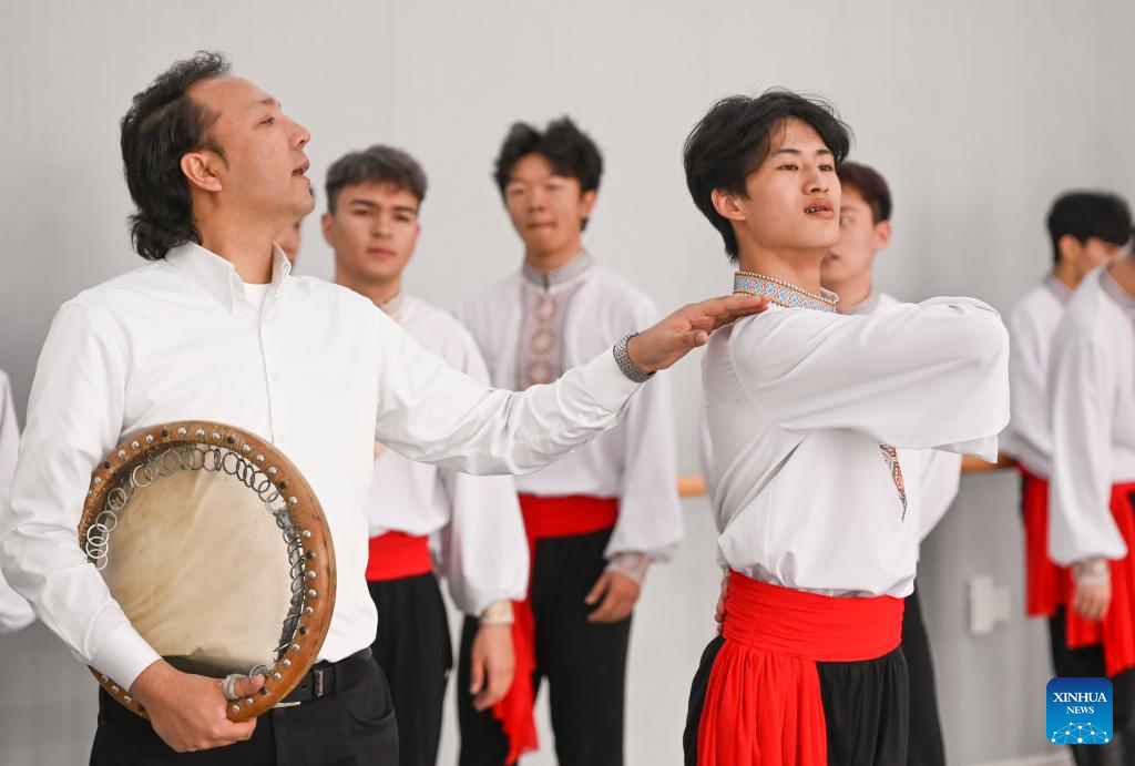 Luo Hao (R, front) practices Uygur dance with the guidance of his teacher Memet Mamut (L, front) at the Dance Academy of Xinjiang Arts University in Urumqi, northwest China's Xinjiang Uygur Autonomous Region, April 14, 2025. (Photo by Xu Rui/Xinhua)