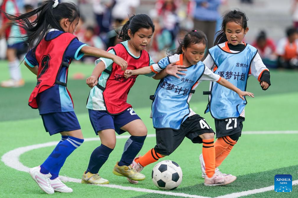 Students of Guzhou Town No. 6 Primary School compete during a football match between classes in Rongjiang County, southwest China's Guizhou Province, April 25, 2025. (Photo by Wang Bingzhen/Xinhua)
