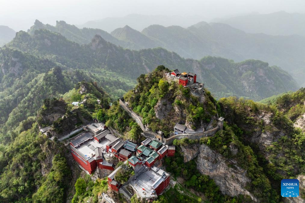 This aerial drone photo taken on April 22, 2025 shows a view of Wudang Mountain in central China's Hubei Province. (Xinhua/Wu Zhizun)
