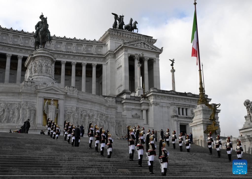 A ceremony to mark 80th anniversary of Liberation Day is held at the Vittoriano Monument in Rome, Italy, on April 25, 2025. Italy marked the 80th anniversary of its liberation from fascism on Friday with a range of activities across the country. (Photo by Alberto Lingria/Xinhua)