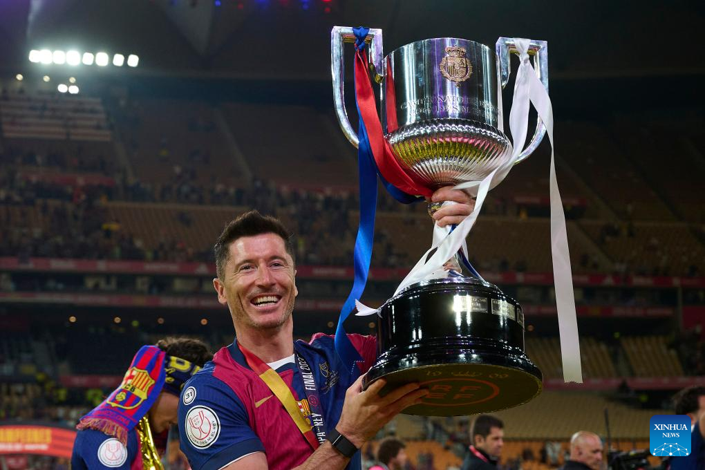 Robert Lewandowski of FC Barcelona celebrates with the trophy after the Copa del Rey football match between FC Barcelona and Real Madrid, in La Cartuja Stadium, Seville, Spain, on April 27, 2025. (Photo by Pablo Morano/Xinhua)