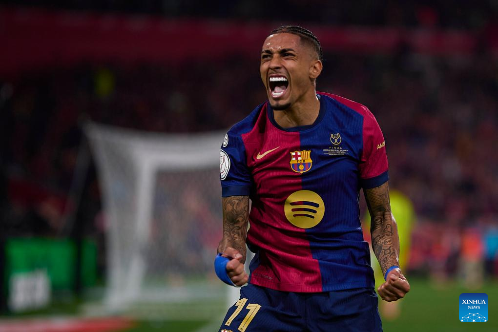 Raphinha of FC Barcelona celebrates during the Copa del Rey football match between FC Barcelona and Real Madrid, in La Cartuja Stadium, Seville, Spain, on April 26, 2025. (Photo by Pablo Morano/Xinhua)