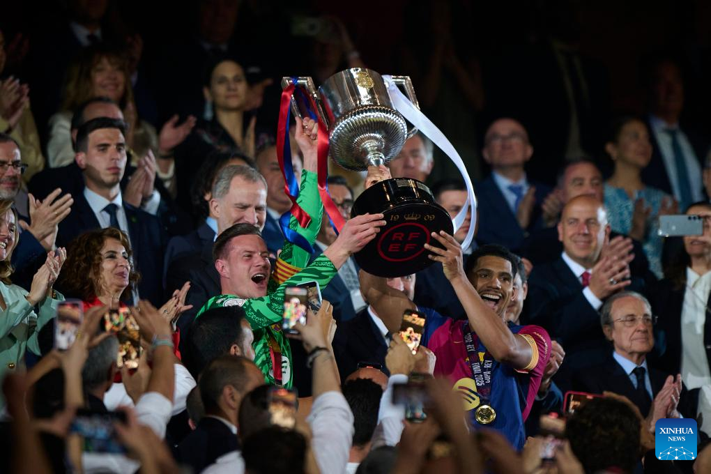 Players of FC Barcelona celebrate with the trophy after the Copa del Rey football match between FC Barcelona and Real Madrid, in La Cartuja Stadium, Seville, Spain, on April 27, 2025. (Photo by Pablo Morano/Xinhua)
