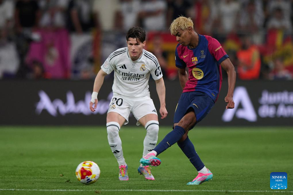 Lamine Yamal (R) of FC Barcelona vies with Fran Garcia of Real Madrid during the Copa del Rey football match between FC Barcelona and Real Madrid, in La Cartuja Stadium, Seville, Spain, on April 26, 2025. (Photo by Pablo Morano/Xinhua)
