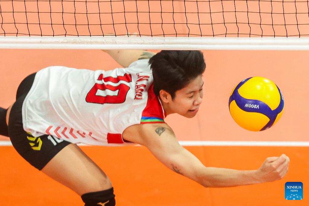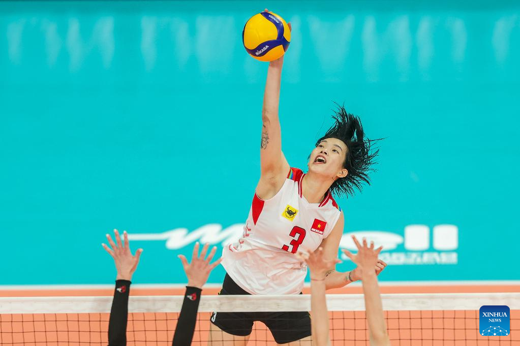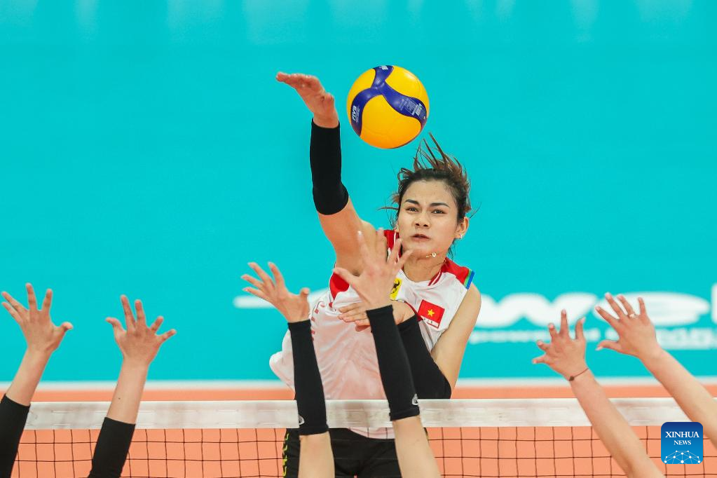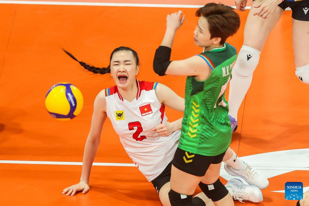 Tran Thi Thanh Thuy of Vietnam's VTV Binh Dien Long An competes during the final match between Kazakhstan's Zhetysu VC and Vietnam's VTV Binh Dien Long An at the AVC Women's Volleyball Champions League in Pasig City, the Philippines, April 27, 2025. (Xinhua/Rouelle Umali)