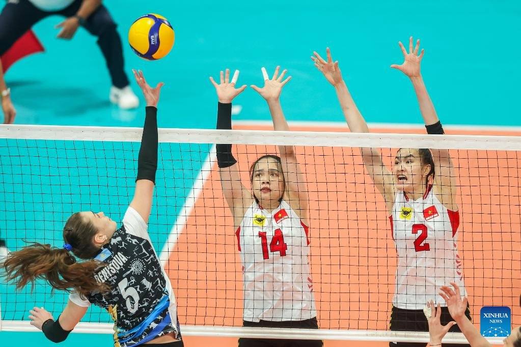 Tran Thi Thanh Thuy (back) of Vietnam's VTV Binh Dien Long An competes during the final match between Kazakhstan's Zhetysu VC and Vietnam's VTV Binh Dien Long An at the AVC Women's Volleyball Champions League in Pasig City, the Philippines, April 27, 2025. (Xinhua/Rouelle Umali)