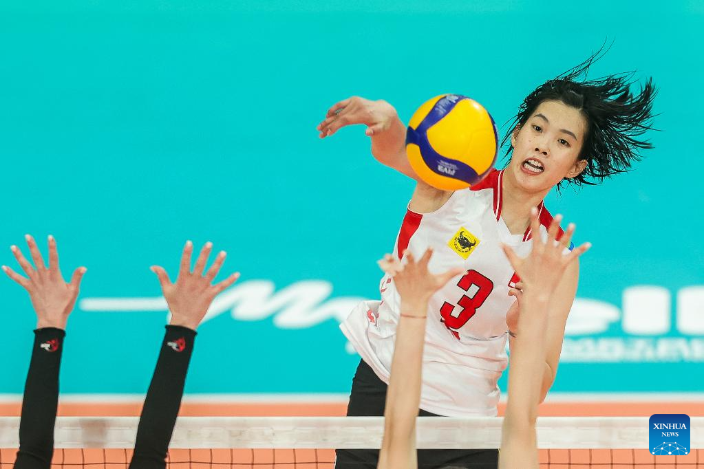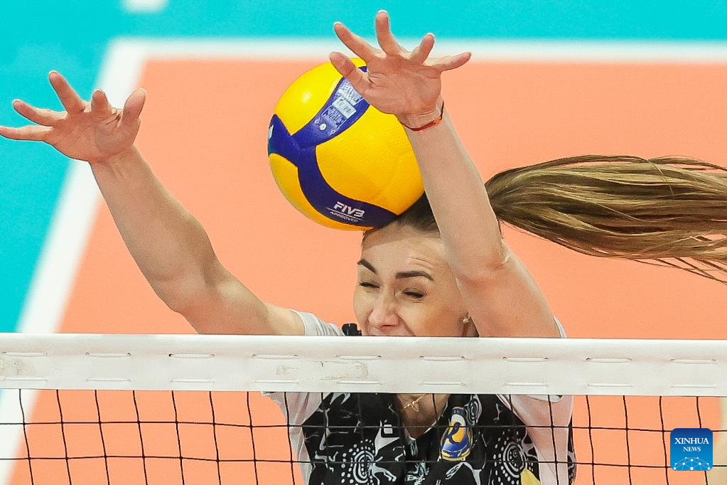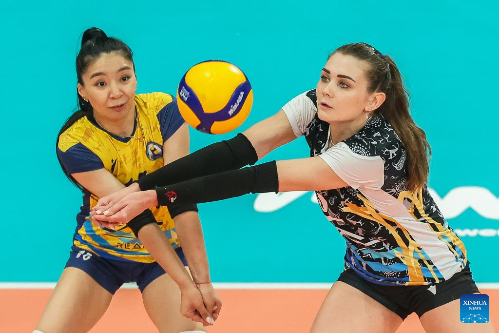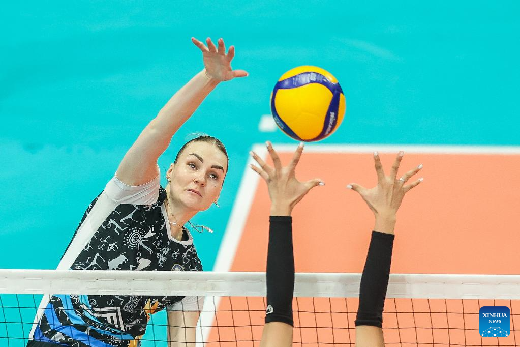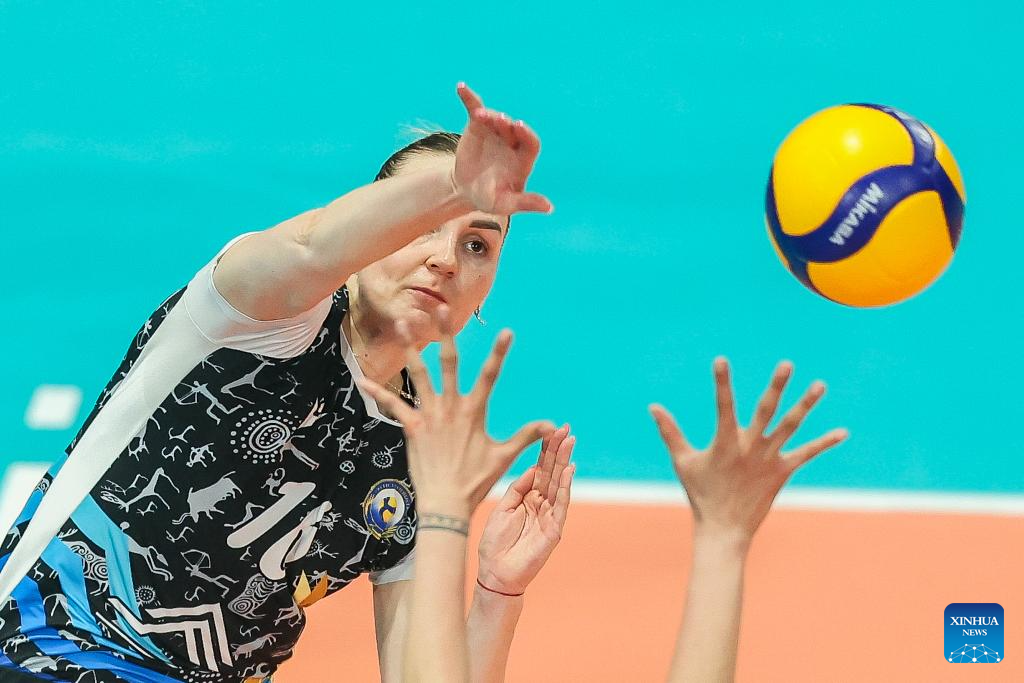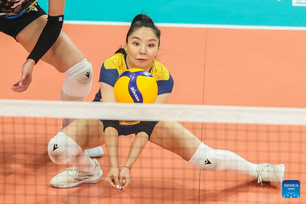 Kristina Anikonova of Kazakhstan's Zhetysu VC competes during the final match between Kazakhstan's Zhetysu VC and Vietnam's VTV Binh Dien Long An at the AVC Women's Volleyball Champions League in Pasig City, the Philippines, April 27, 2025. (Xinhua/Rouelle Umali)