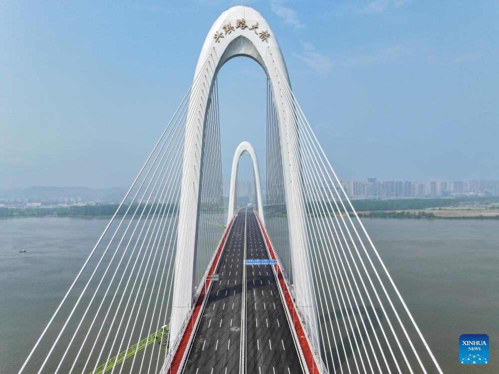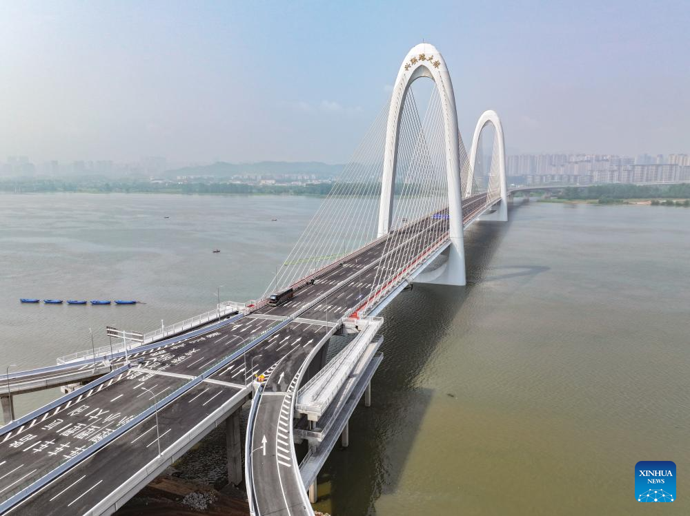 An aerial drone photo taken on April 28, 2025 shows a view of the Xinglianlu grand bridge in Changsha, central China's Hunan Province. The Xinglianlu grand bridge in Changsha started trial operation on Monday. The infrastructure spans a total length of 5.475 kilometers, with the main bridge over the Xiangjiang River measuring 4.96 kilometers. It features eight lanes for bi-directional traffic and serves as a vital east-west thoroughfare in the northern urban area of Changsha. The bridge is expected to significantly alleviate traffic congestion on the city's north second ring road. (Xinhua/Chen Zeguo)