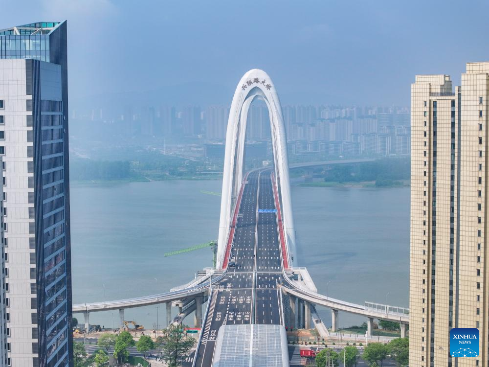 An aerial drone photo taken on April 28, 2025 shows the inauguration ceremony of the Xinglianlu grand bridge in Changsha, central China's Hunan Province. The Xinglianlu grand bridge in Changsha started trial operation on Monday. The infrastructure spans a total length of 5.475 kilometers, with the main bridge over the Xiangjiang River measuring 4.96 kilometers. It features eight lanes for bi-directional traffic and serves as a vital east-west thoroughfare in the northern urban area of Changsha. The bridge is expected to significantly alleviate traffic congestion on the city's north second ring road. (Xinhua/Chen Zeguo)