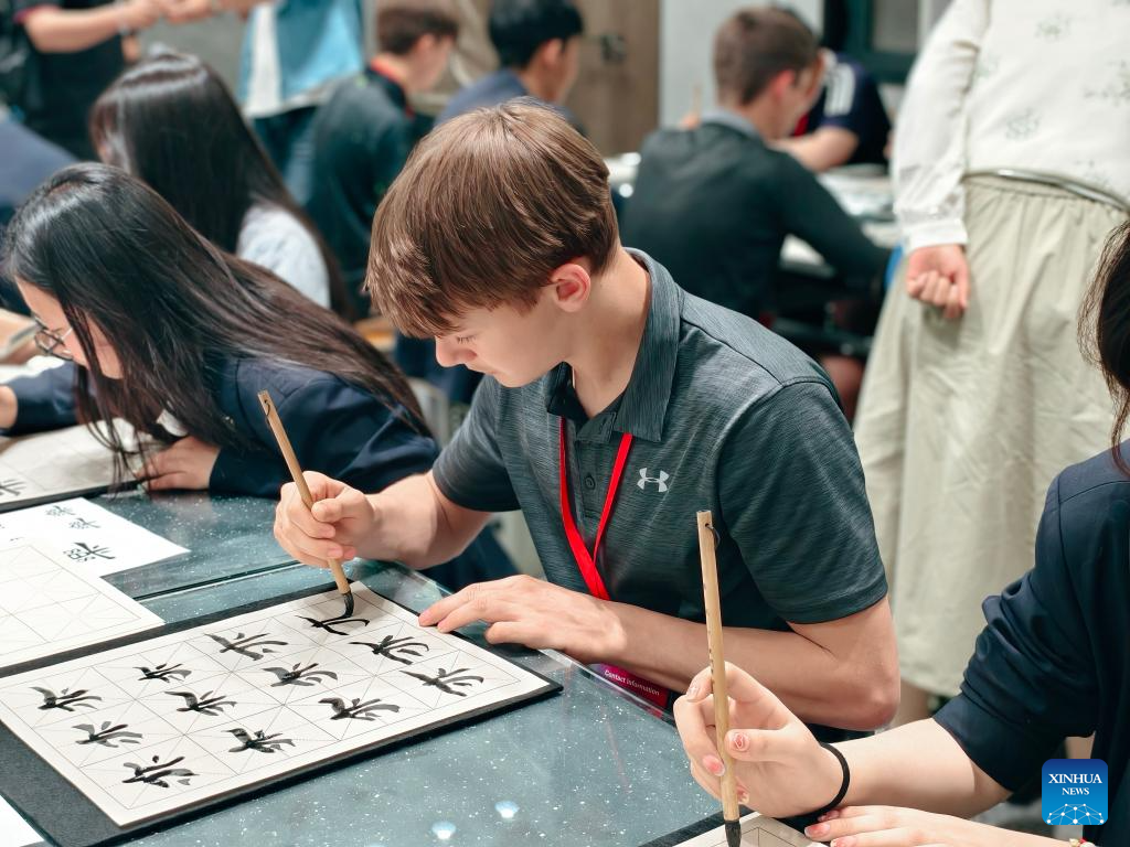 A student from the United States learns Chinese calligraphy during a study tour in Shijiazhuang, north China's Hebei Province, April 26, 2025. (Xinhua/Huang Yuzhang)
