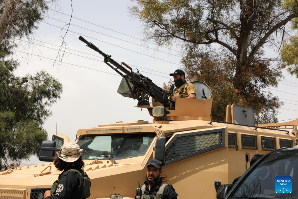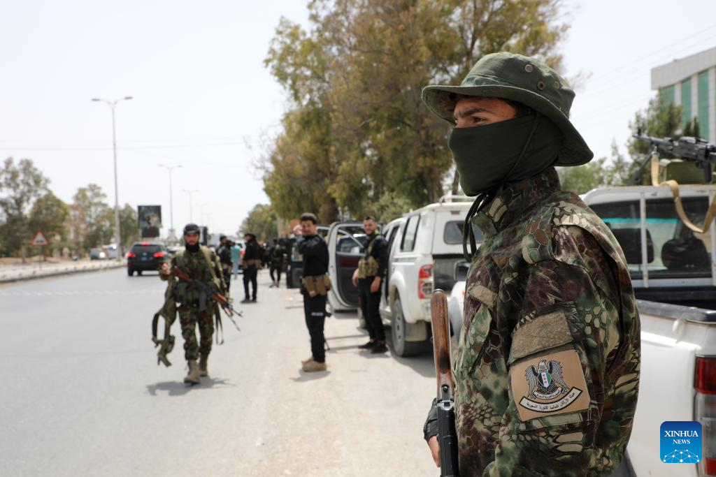 Syrian security forces are seen in the town of Ashrafiyat Sahnaya, southwest of Damascus, Syria, on April 30, 2025. (Str/Xinhua)