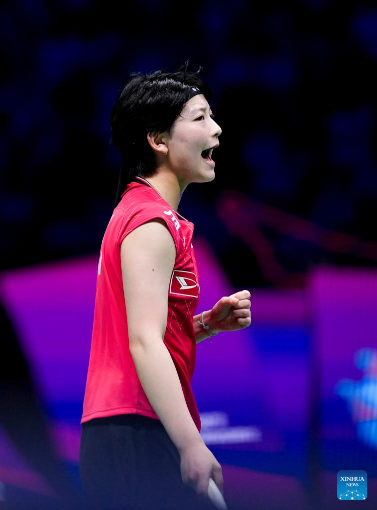 Miyazaki Tomoka of Japan celebrates a score in the women's singles match against Goh Jin Wei of Malaysia during the Group C match between Japan and Malaysia at BWF Sudirman Cup in Xiamen, southeast China's Fujian Province, May 1, 2025. (Xinhua/Sun Fei)