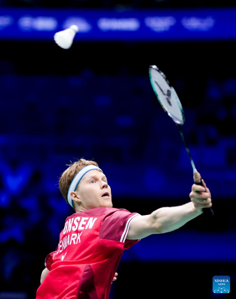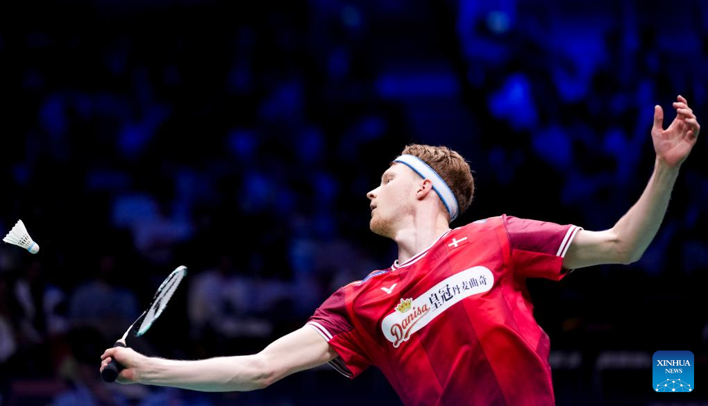 Anders Antonsen of Denmark hits a return in the men's singles match against Alwi Farhan of Indonesia during the Group D match between Denmark and Indonesia at BWF Sudirman Cup in Xiamen, southeast China's Fujian Province, May 1, 2025. (Xinhua/Sun Fei)