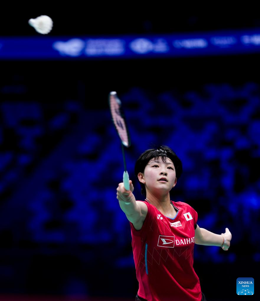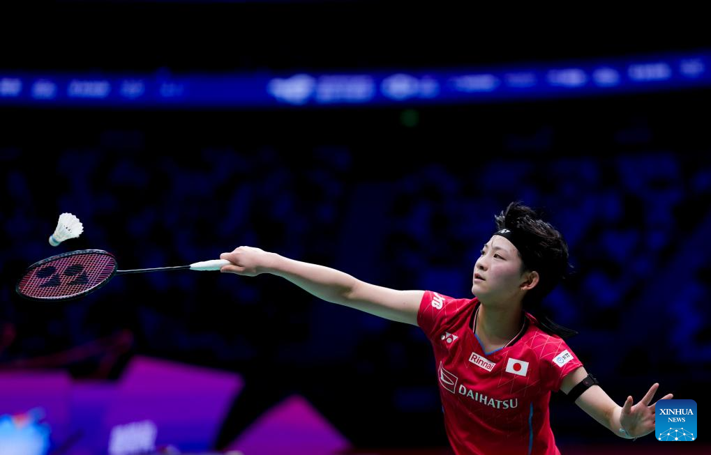 Miyazaki Tomoka of Japan hits a return in the women's singles match against Goh Jin Wei of Malaysia during the Group C match between Japan and Malaysia at BWF Sudirman Cup in Xiamen, southeast China's Fujian Province, May 1, 2025. (Xinhua/Sun Fei)