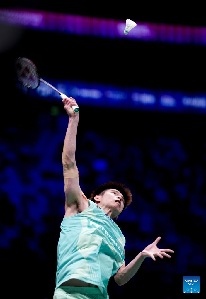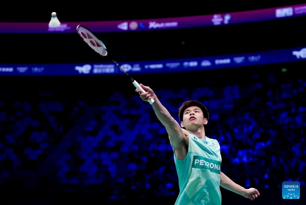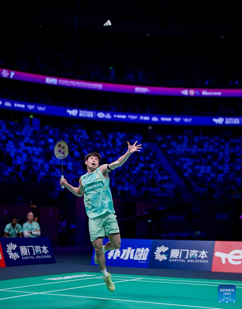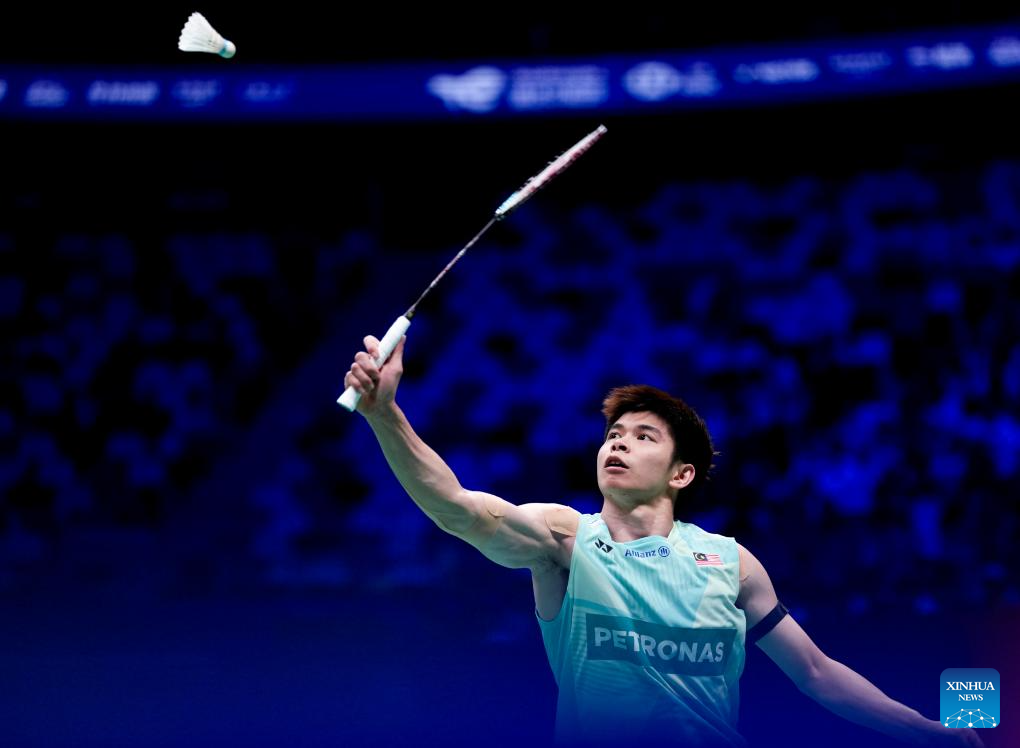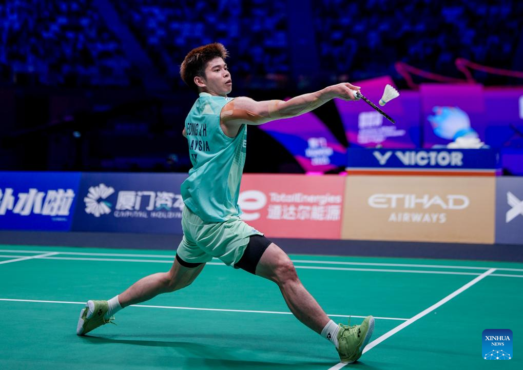 Leong Jun Hao of Malaysia hits a return in the men's singles match against Naraoka Kodai of Japan during the Group C match between Japan and Malaysia at BWF Sudirman Cup in Xiamen, southeast China's Fujian Province, May 1, 2025. (Xinhua/Sun Fei)