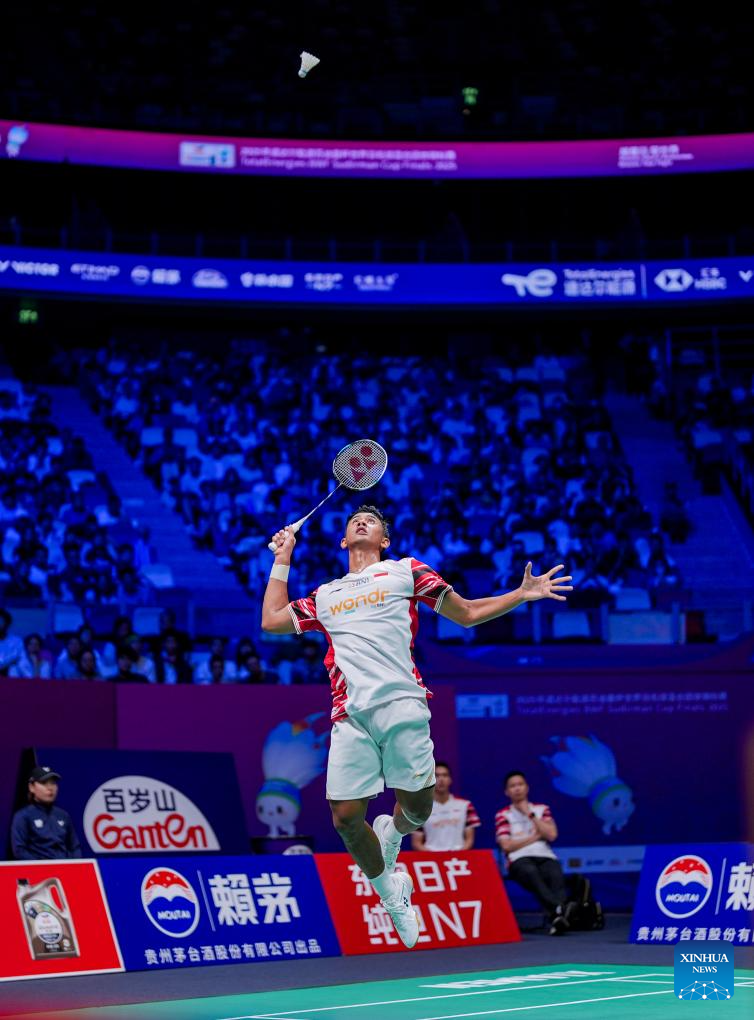 Alwi Farhan of Indonesia hits a return in the men's singles match against Anders Antonsen of Denmark during the Group D match between Denmark and Indonesia at BWF Sudirman Cup in Xiamen, southeast China's Fujian Province, May 1, 2025. (Xinhua/Sun Fei)