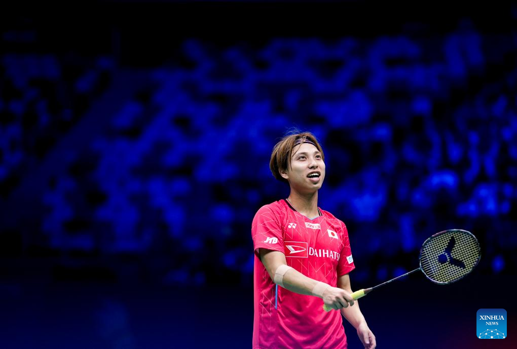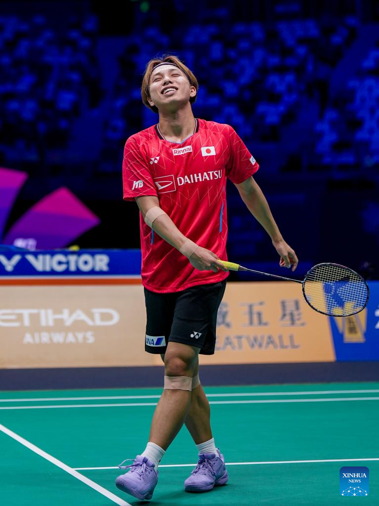 Naraoka Kodai of Japan reacts in the men's singles match against Leong Jun Hao of Malaysia during the Group C match between Japan and Malaysia at BWF Sudirman Cup in Xiamen, southeast China's Fujian Province, May 1, 2025. (Xinhua/Sun Fei)