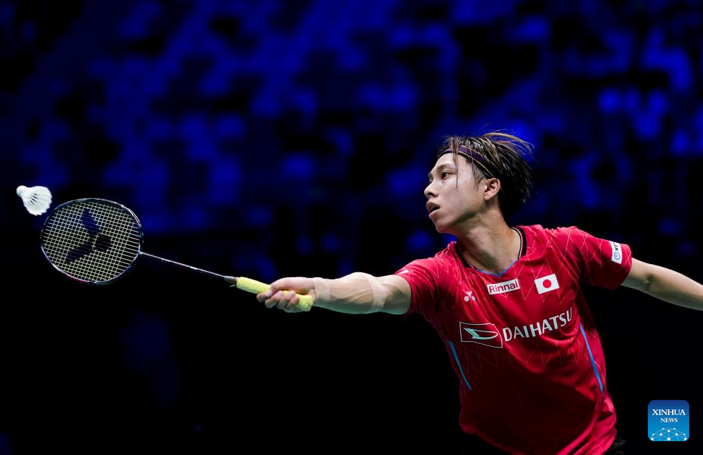 Naraoka Kodai of Japan hits a return in the men's singles match against Leong Jun Hao of Malaysia during the Group C match between Japan and Malaysia at BWF Sudirman Cup in Xiamen, southeast China's Fujian Province, May 1, 2025. (Xinhua/Sun Fei)