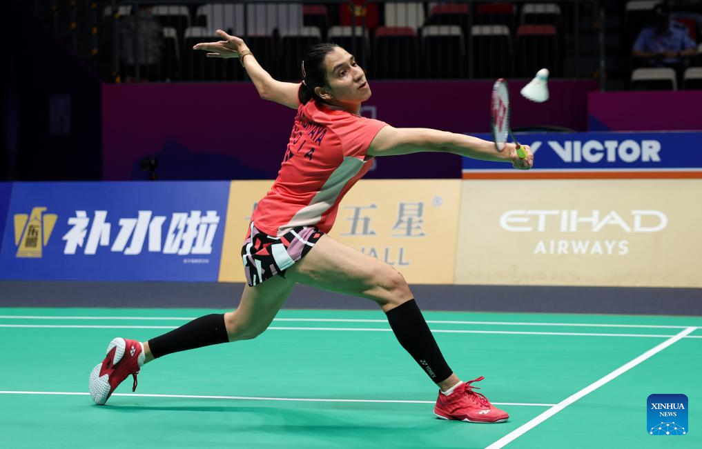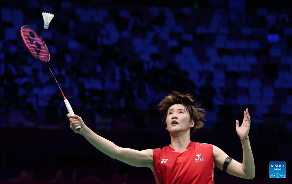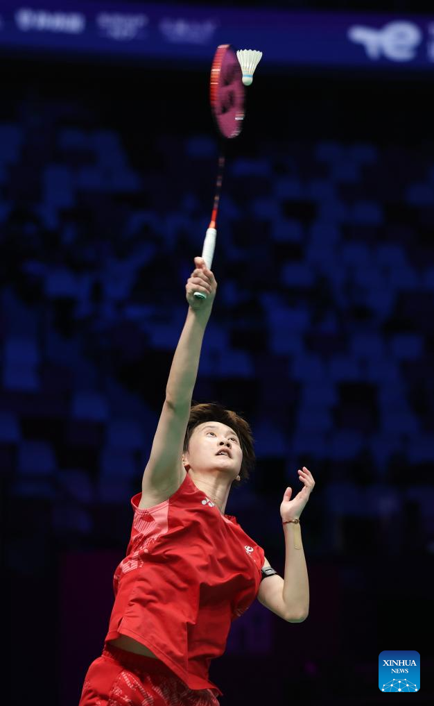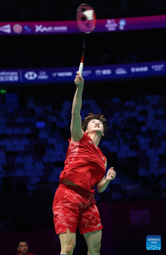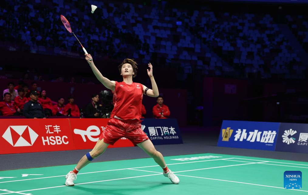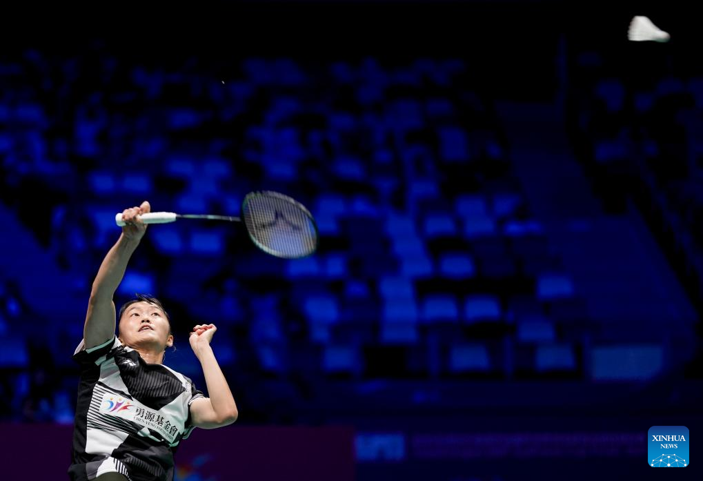 Chen Yufei of China hits a return in the women's singles match against Karupathevan Letshanaa of Malaysia during the quarterfinal match between China and Malaysia at BWF Sudirman Cup in Xiamen, southeast China's Fujian Province, May 2, 2025. (Xinhua/Wang Kaiyan)