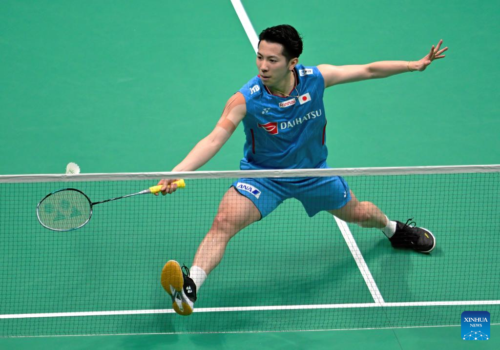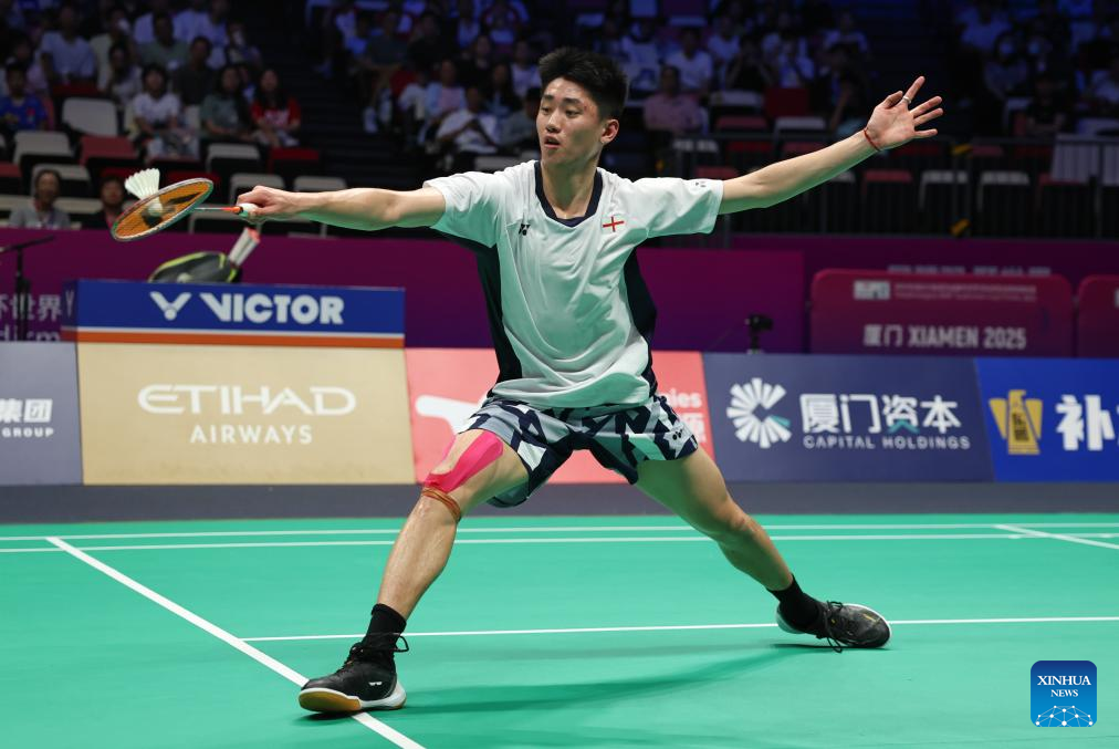 Chou Tien Chen of Chinese Taipei hits a return in the men's singles match against Watanabe Koki of Japan during the quarterfinal match between Japan and Chinese Taipei at BWF Sudirman Cup in Xiamen, southeast China's Fujian Province, May 2, 2025. (Xinhua/Wang Kaiyan)