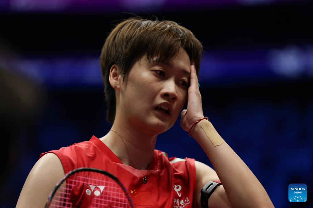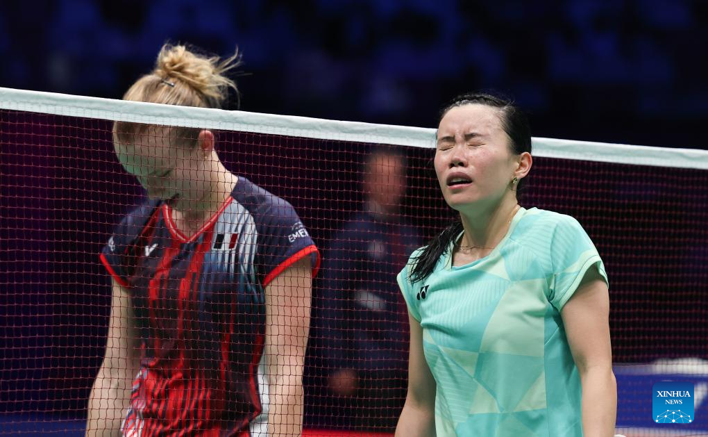 Chen Yufei of China reacts in the women's singles match against Karupathevan Letshanaa of Malaysia during the quarterfinal match between China and Malaysia at BWF Sudirman Cup in Xiamen, southeast China's Fujian Province, May 2, 2025. (Xinhua/Wang Kaiyan)