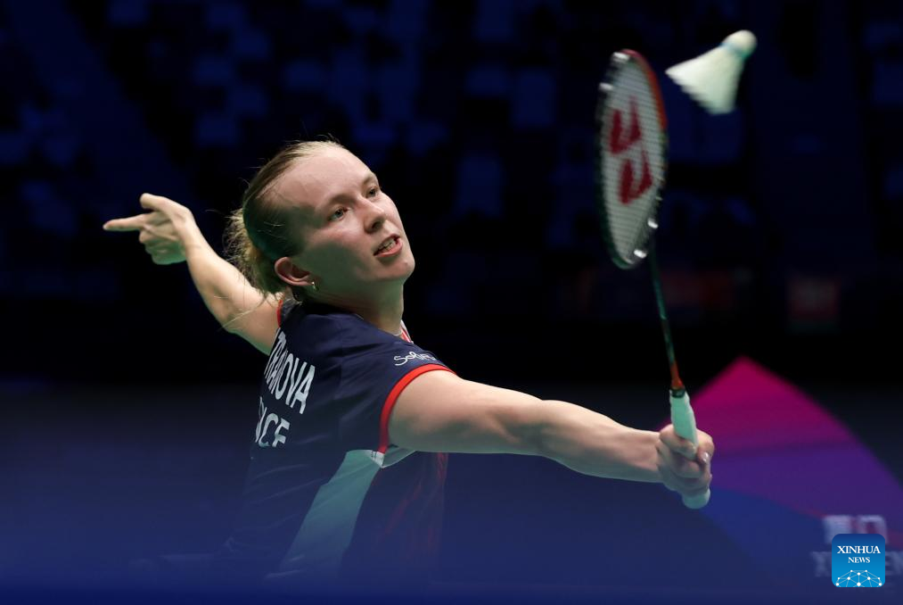 Anna Tatranov of France hits a return during the women's singles match against Tiffany Ho of Australia of the Group C match between France and Australia at BWF Sudirman Cup in Xiamen, southeast China's Fujian Province, May 1, 2025. (Xinhua/Wang Kaiyan)