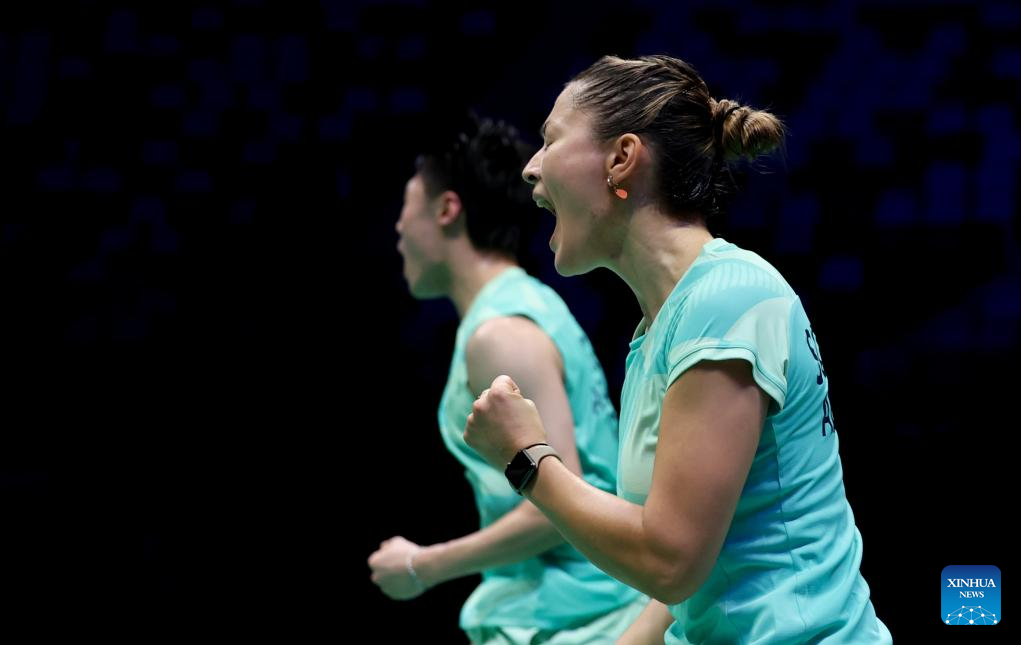Ricky Tang/Gronya Somerville (R) of Australia celebrate scoring during the mixed doubles match against Gregoire Deschamp/Margot Lambert of France of the Group C match between France and Australia at BWF Sudirman Cup in Xiamen, southeast China's Fujian Province, May 1, 2025. (Xinhua/Wang Kaiyan)
