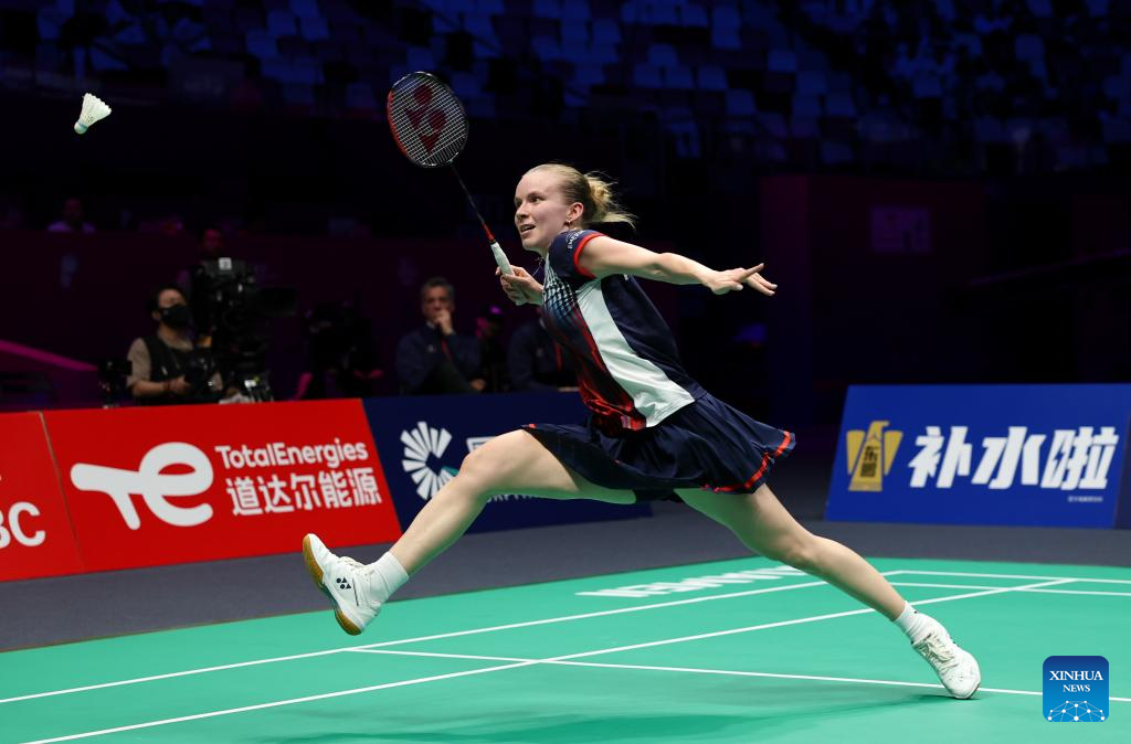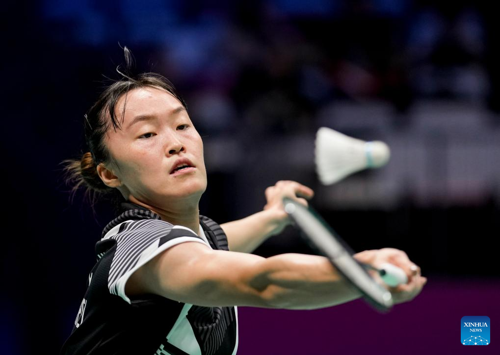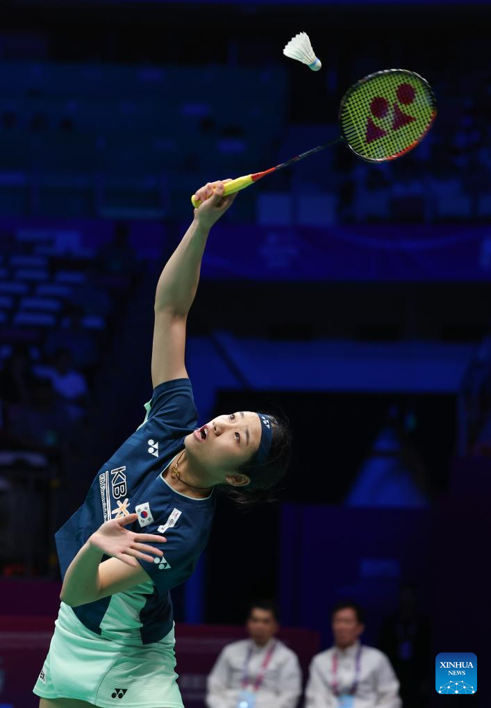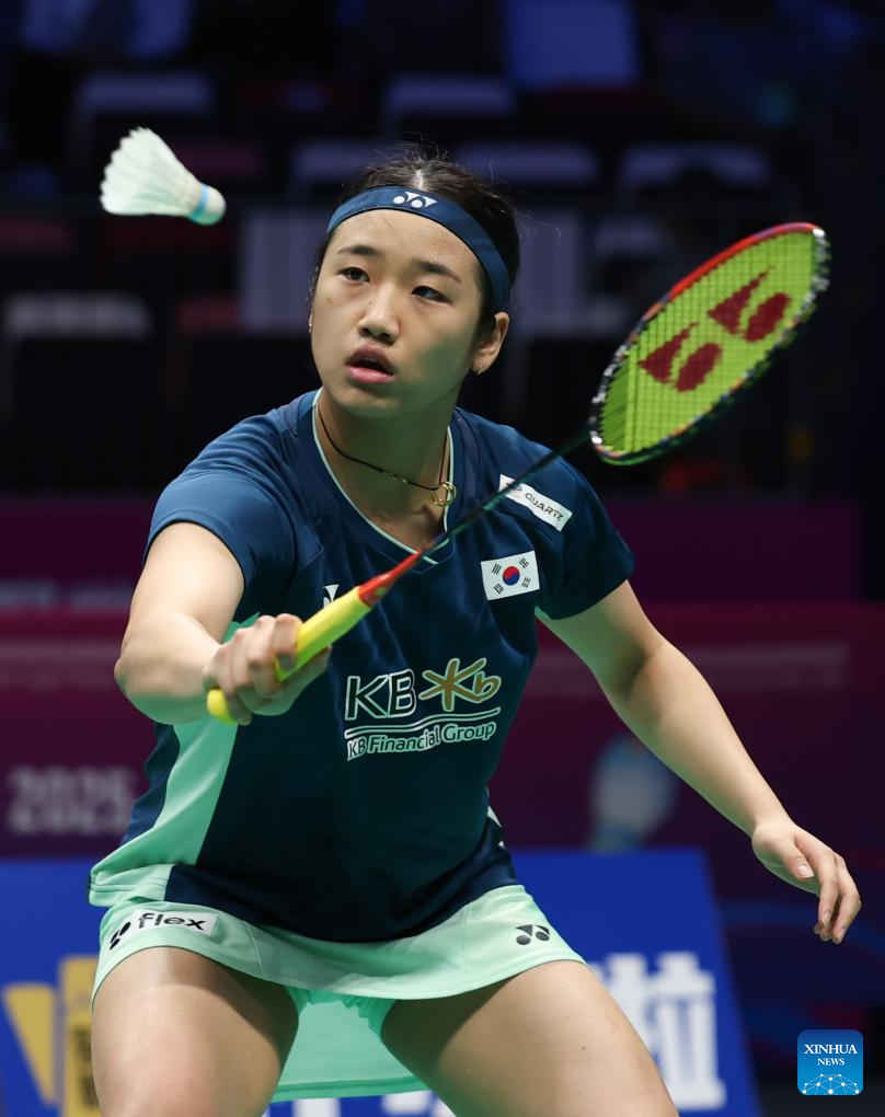 An Se Young of South Korea hits a return in the women's singles match against Line Hojmark Kjaersfeldt of Denmark during the quarterfinal match between South Korea and Denmark at BWF Sudirman Cup in Xiamen, southeast China's Fujian Province, May 2, 2025. (Xinhua/Wang Kaiyan)