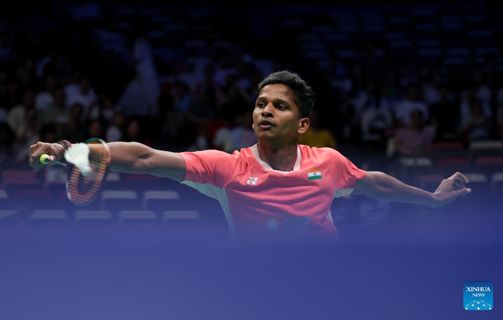 Sathish Kumar Karunakaran of India hits a return during the men's singles match against Harry Huang of England of the Group D match between India and England at BWF Sudirman Cup in Xiamen, southeast China's Fujian Province, May 1, 2025. (Xinhua/Wang Kaiyan)