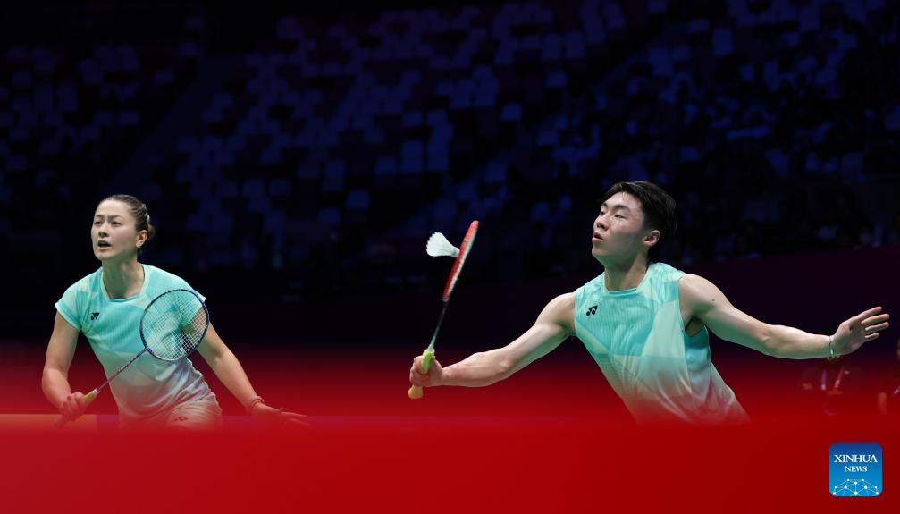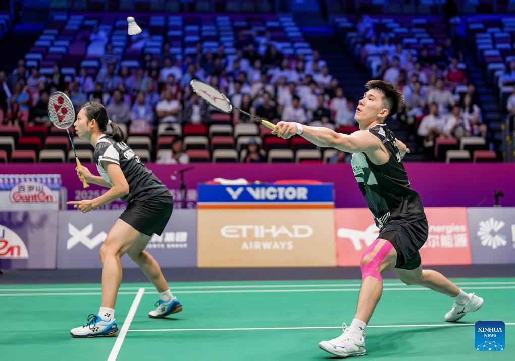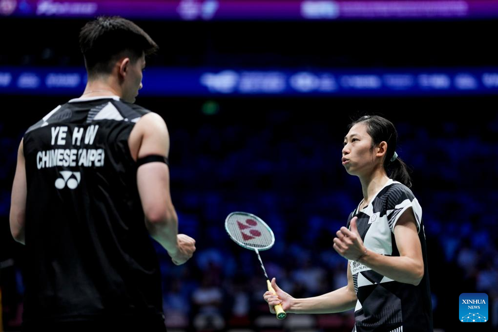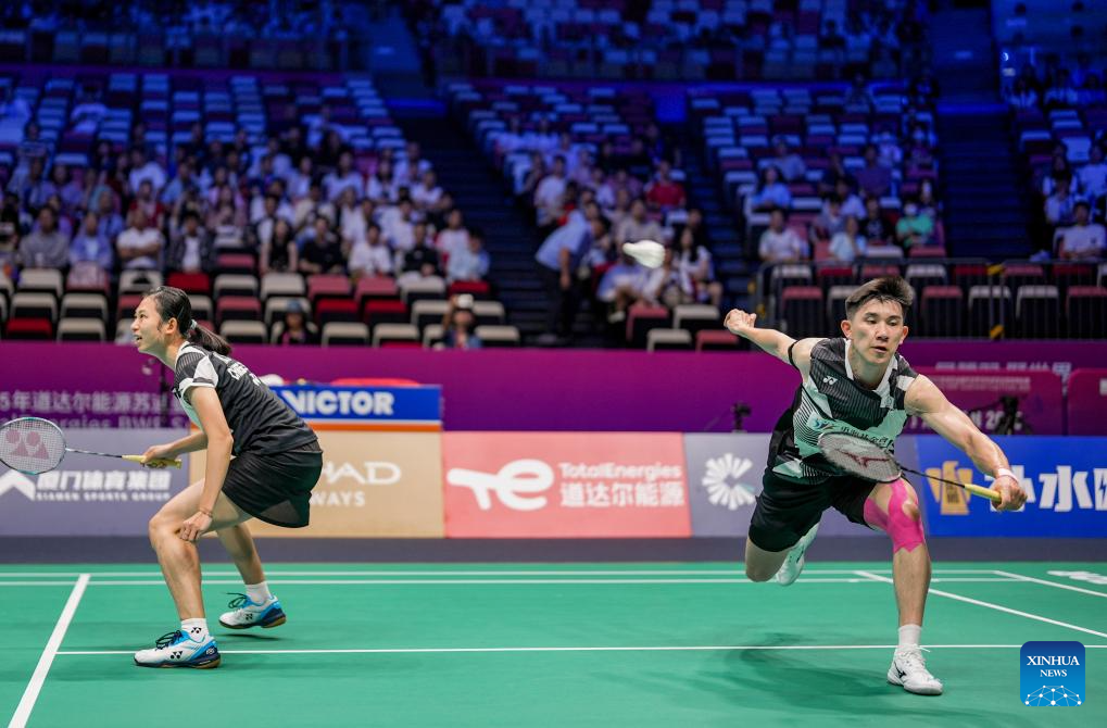 Ye Hong Wei (R)/Hu Ling Fang of Chinese Taipei compete in the mixed doubles match against Midorikawa Hiroki/Igarashi Arisa of Japan during the quarterfinal match between Japan and Chinese Taipei at BWF Sudirman Cup in Xiamen, southeast China's Fujian Province, May 2, 2025. (Xinhua/Sun Fei)