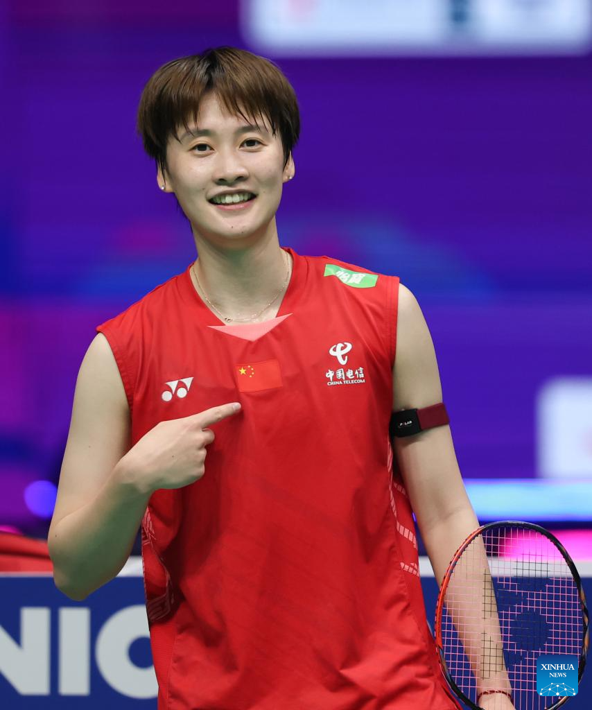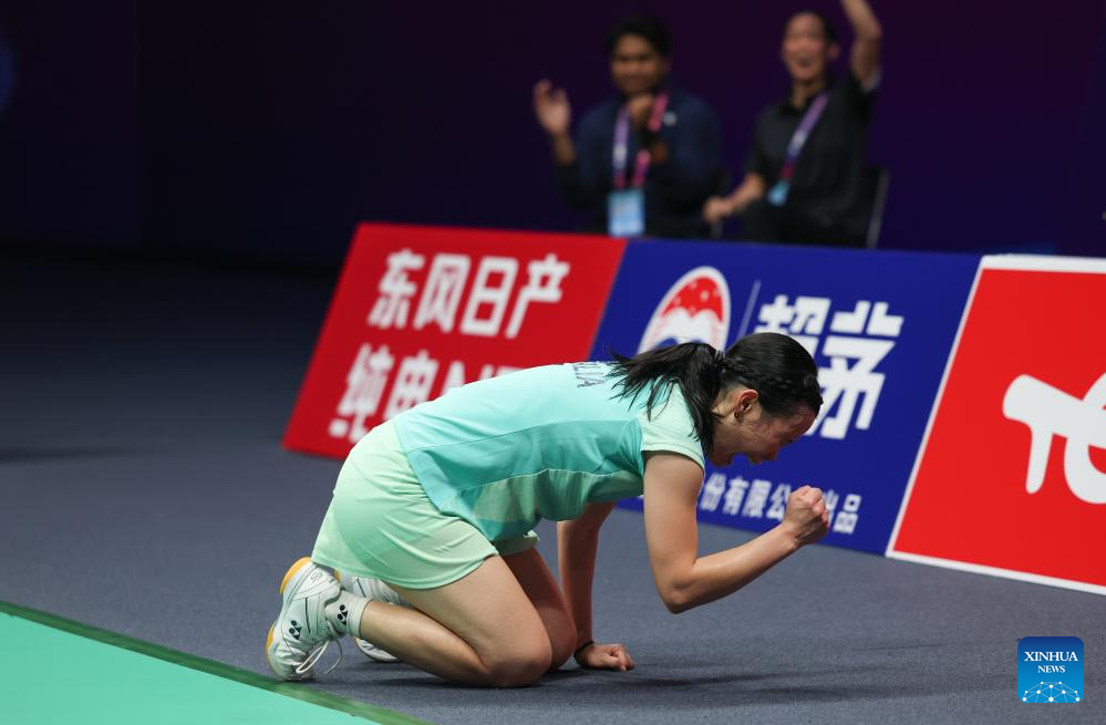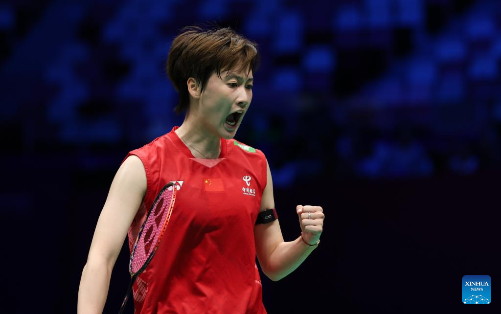 Chen Yufei of China celebrates after winning the women's singles match against Karupathevan Letshanaa of Malaysia during the quarterfinal match between China and Malaysia at BWF Sudirman Cup in Xiamen, southeast China's Fujian Province, May 2, 2025. (Xinhua/Wang Kaiyan)