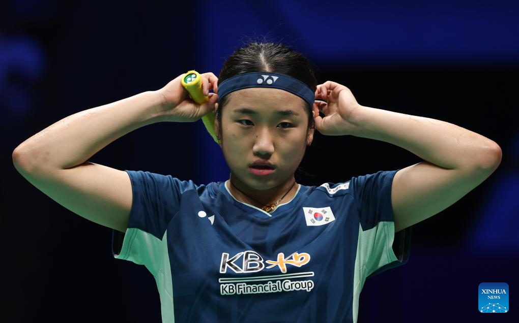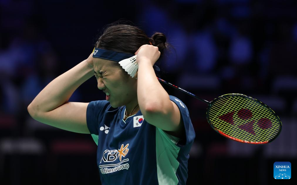 An Se Young of South Korea reacts in the women's singles match against Line Hojmark Kjaersfeldt of Denmark during the quarterfinal match between South Korea and Denmark at BWF Sudirman Cup in Xiamen, southeast China's Fujian Province, May 2, 2025. (Xinhua/Wang Kaiyan)