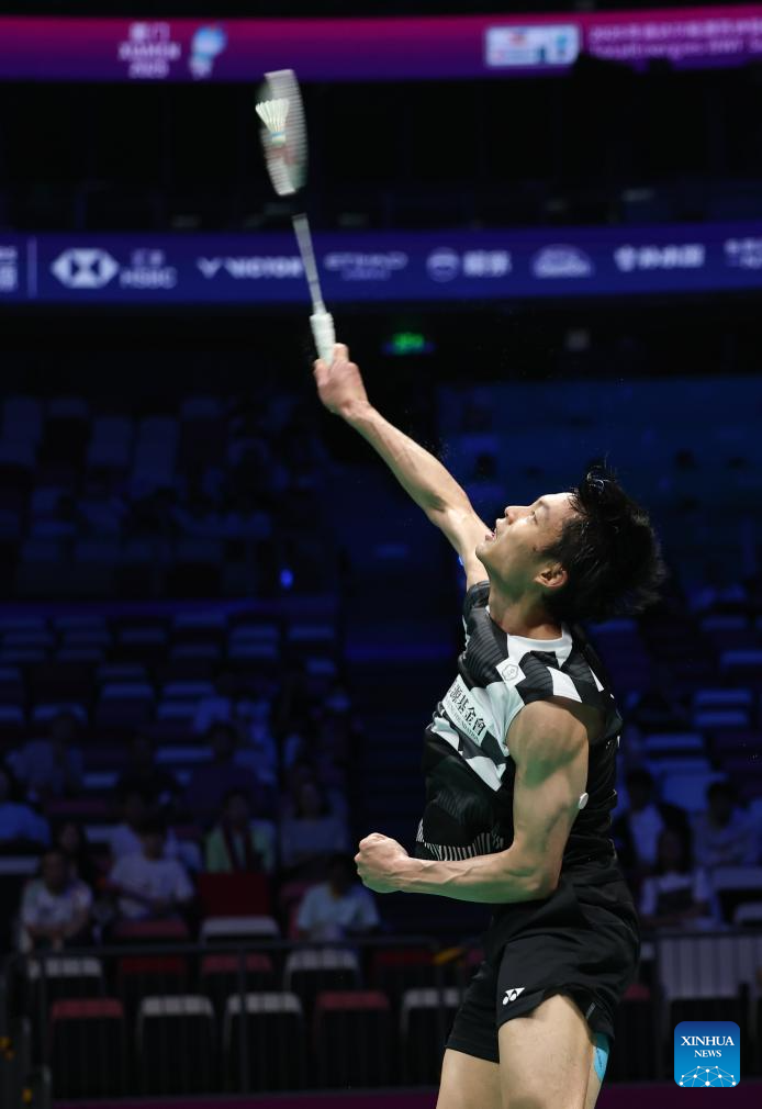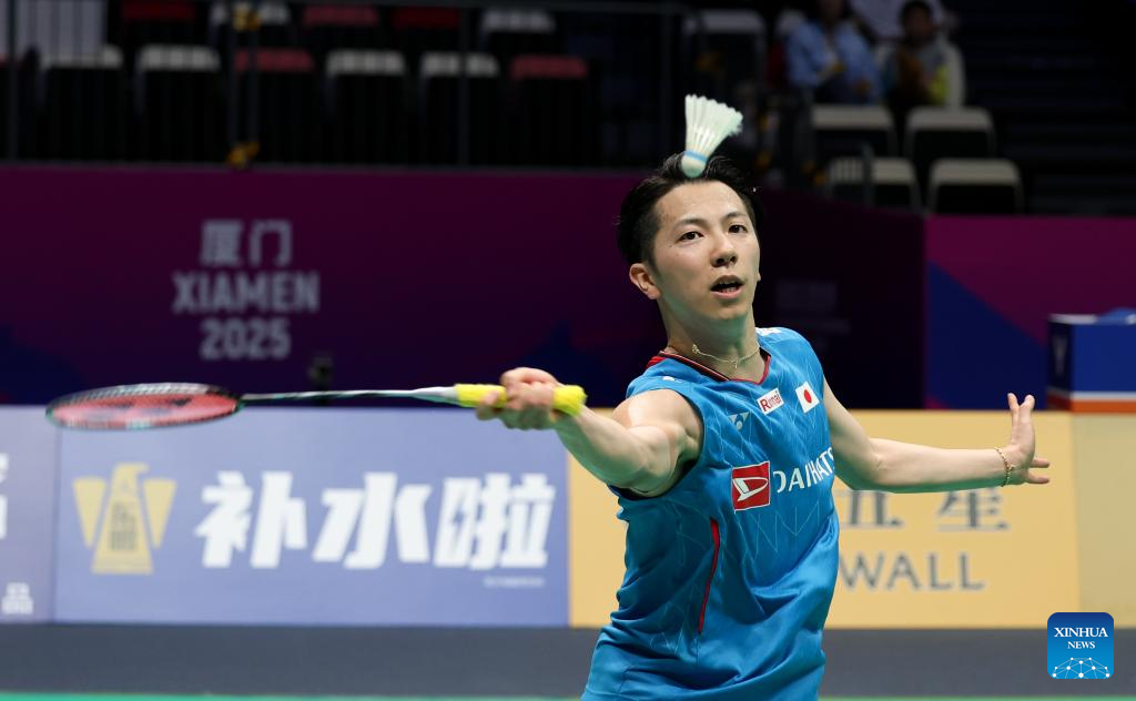 Watanabe Koki of Japan hits a return in the men's singles match against Chou Tien Chen of Chinese Taipei during the quarterfinal match between Japan and Chinese Taipei at BWF Sudirman Cup in Xiamen, southeast China's Fujian Province, May 2, 2025. (Xinhua/Wang Kaiyan)